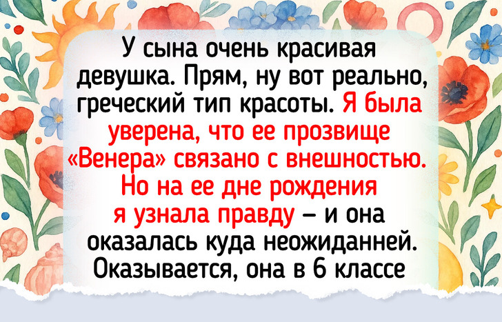 - У моего 20-летнего сына очень красивая девушка. Такой у нее греческий тип красоты. В компании их друзей ее называют Венера. Я была уверена, что прозвище связано именно с красотой. Вчера вся их орава праздновала у нас ее день рождения. И как же я офигела, когда оказалось что «Венера» она, потому что в шестом классе сломала на фикультуре обе руки сразу и 2 месяца ходила в гипсе! Типа Венера Милосская, блин. © Карамель / VK