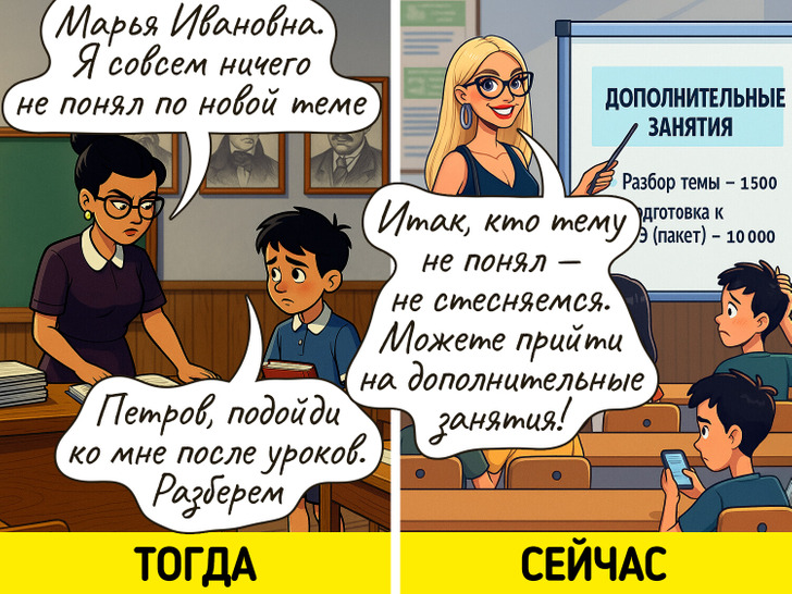 16. Время идет, подходы меняются. Раньше учителя объясняли просто так, теперь — с прайсом. Прогресс, ничего не скажешь!