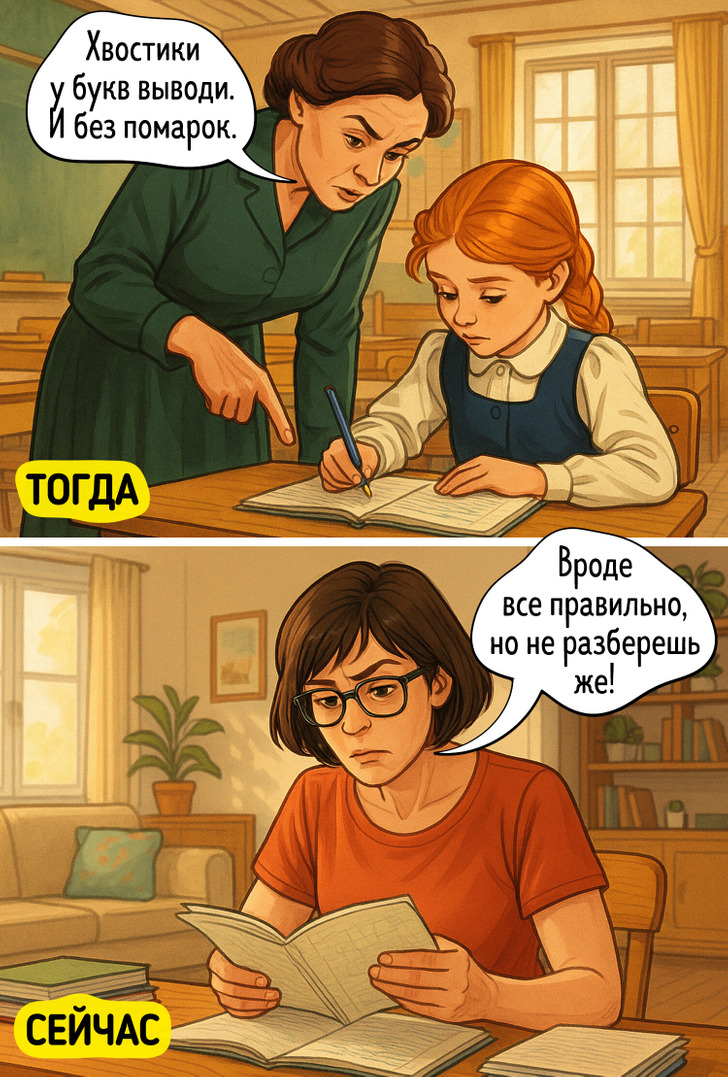 Еще одна боль педагогов нашего времени — неразборчивый детский почерк. А вот многие из нынешних взрослых еще застали уроки чистописания