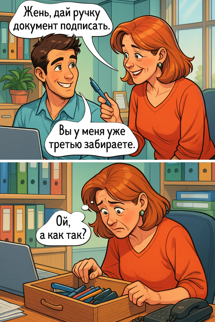 А у вас на работе есть коллега, который по рассеянности собрал целую коллекцию чужих ручек и степлеров?