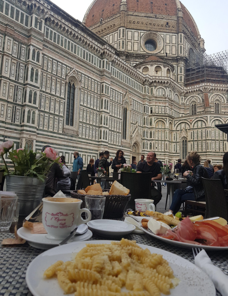 «Наслаждаюсь итальянской едой и кофе с видом на гигантский купол Санта-Мария-дель-Фьоре во Флоренции, Италия»