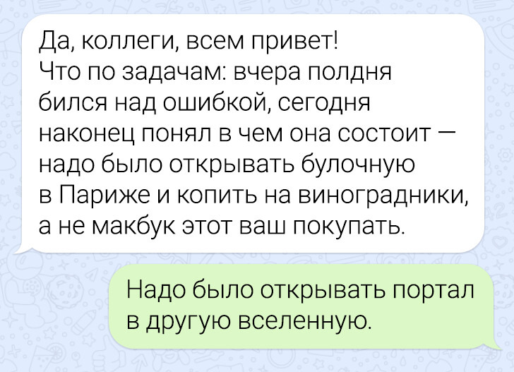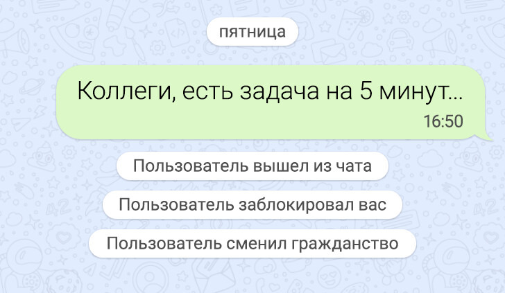 Рабочий чат — это место, где за фразой «Коллеги, есть небольшая задача» часто скрывается сюжет для триллера, а за вежливым «Заранее благодарю» — тихая мольба о пощаде. К счастью, в мире бесконечных дедлайнов и правок юмор становится тем самым средством, которое спасает кукуху от выгорания.