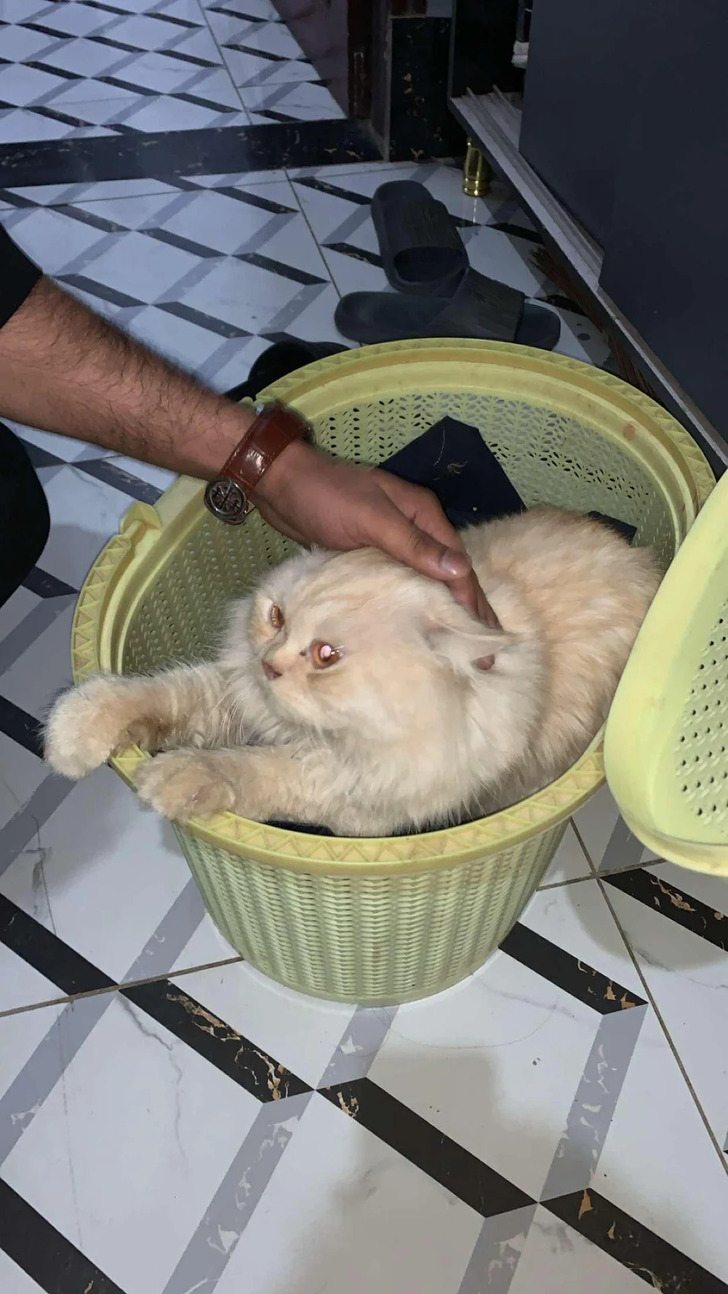 «Почему мой кот выглядит как король, который застрял в корзине для белья?»
