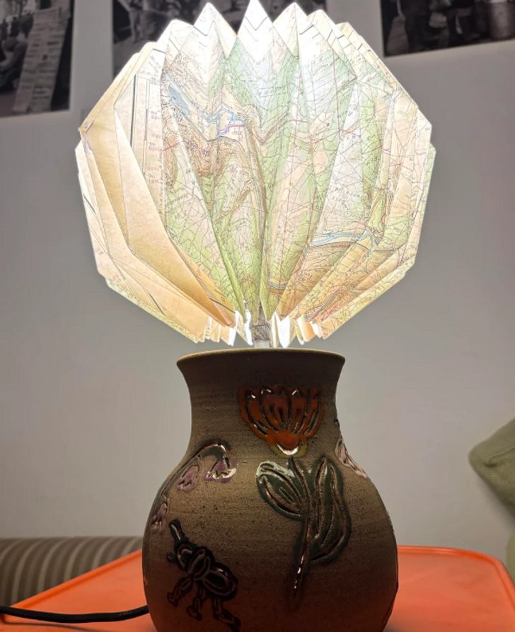 «Моя новая лампа: основание — ваза с гравировкой и расписными цветами, а абажур — оригами, сложенное из старой карты»