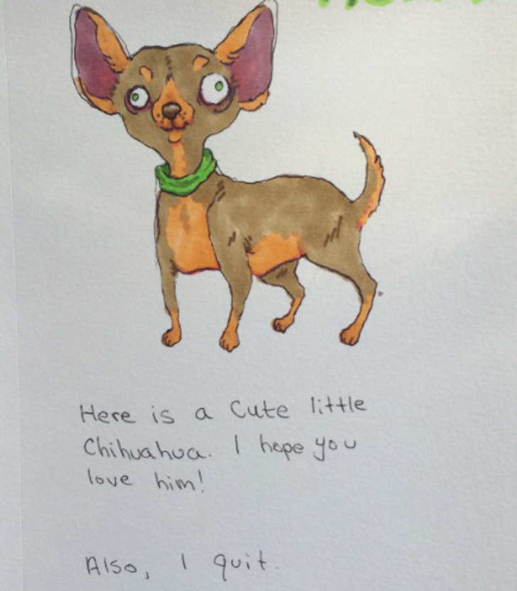 «Это — милая собачка чихуахуа. Надеюсь, она вам понравится! А еще я увольняюсь»