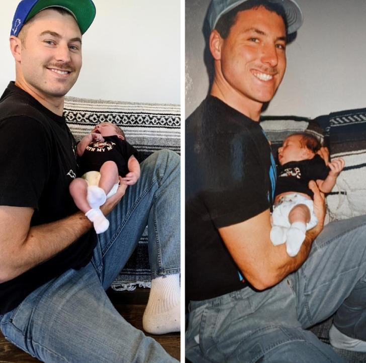 «На первом фото я с новорожденным сыном, а на втором отец держит меня маленького на руках»