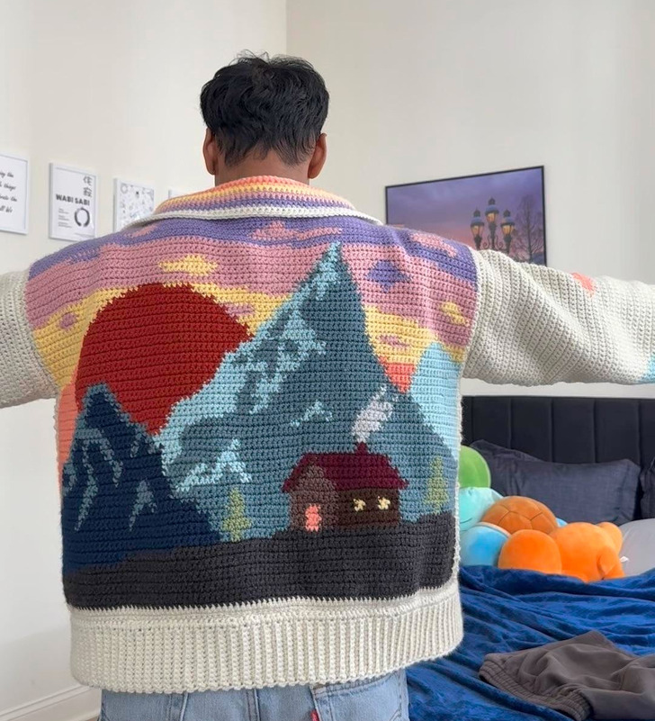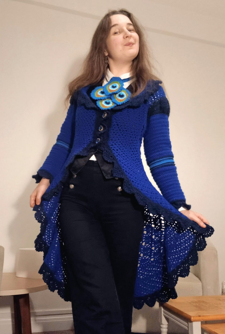 «Кардиган с павлиньим узором. Я начала вязать одежду крючком в прошлом году, и я так рада, что могу воплощать свои идеи в жизнь!»