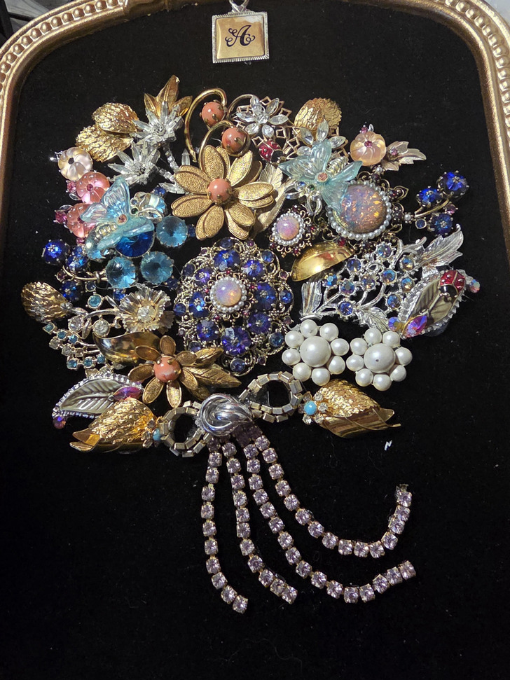 «Подарок на мой день рождения от мамы. Она заказала это панно из бижутерии, принадлежавшей ей и ее матери. Некоторые украшения датируются началом ХХ века»