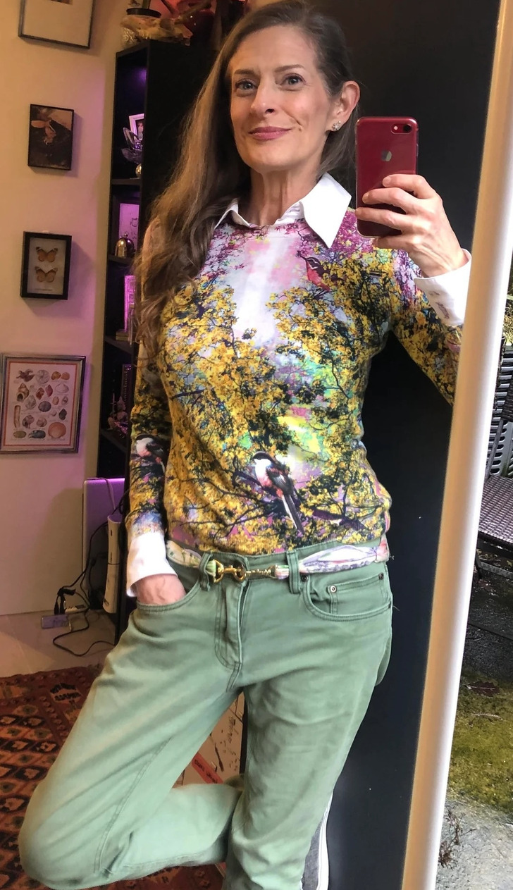 Джемпер из секонд-хенда с весенним принтом стал настоящей находкой. Владелица влюбилась в него и сразу же купила и утверждает, что к нему подходят любые вещи! Как вам такой образ?