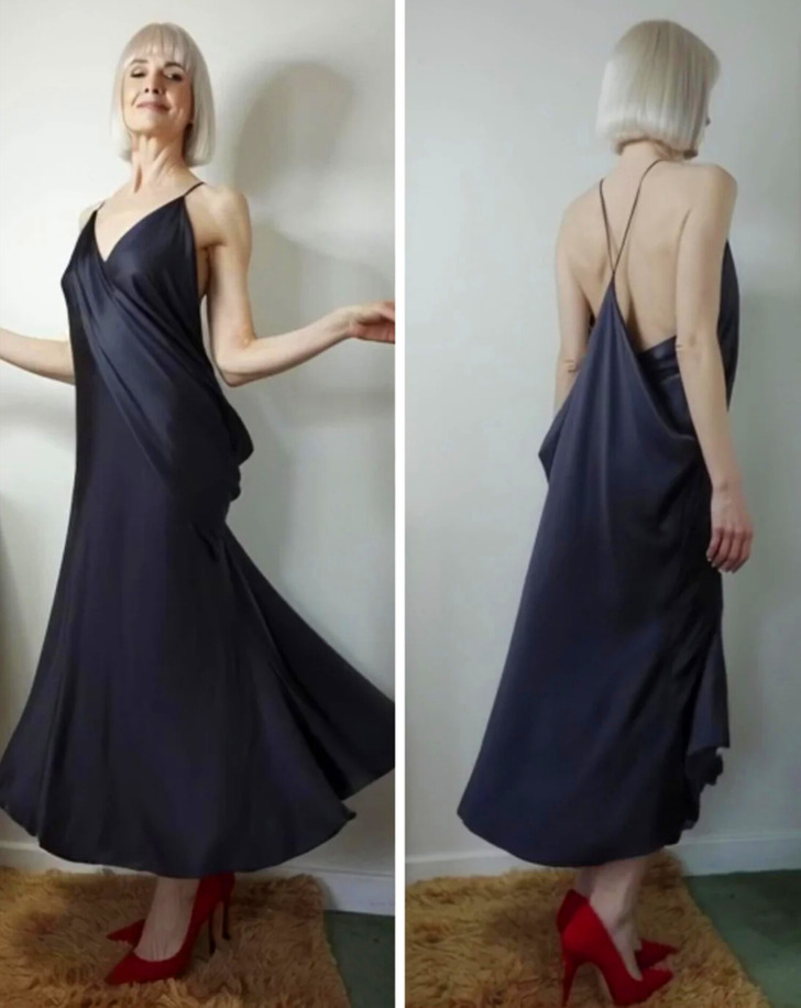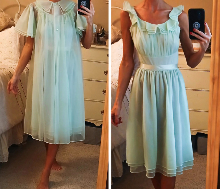 Когда автор поста нашла это платье, свернутое комком в каком-то контейнере, она сначала даже не смогла понять, как его надеть, из-за необычного кроя. Но посмотрите, как оно заиграло, когда было выстирано и отглажено!