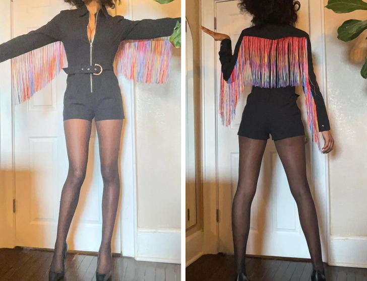 «Комбинезон с бахромой в стиле 70-х — моя мечта. Купила его за $ 4 в комиссионке для вечеринки в стиле диско»