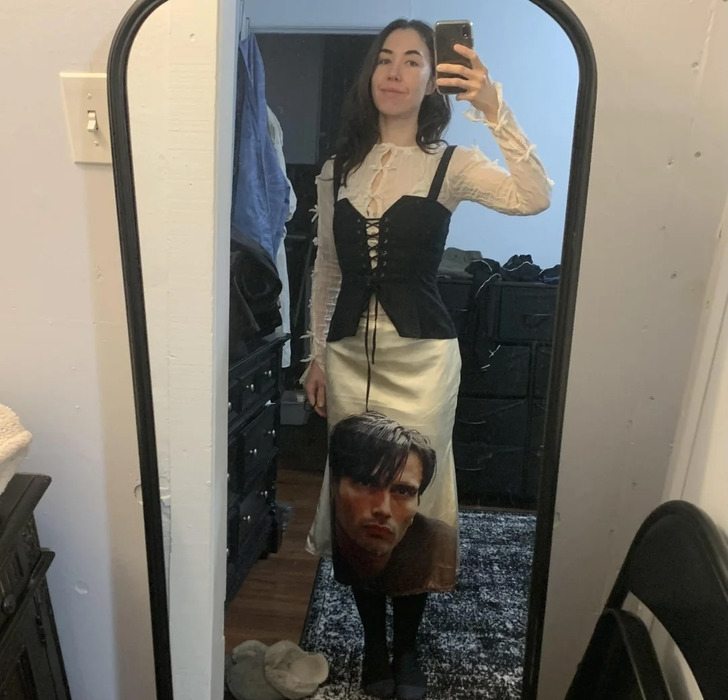 Иногда какая-то вещь так западает в душу, что не можешь успокоиться, пока ей не завладеешь! Увидев это фото, в комментариях пошутили: «Зачем носить обычную юбку, когда можно надеть юбку с изображением Маддса Миккельсена?», а кто-то понадеялся, что комментарий к посту оставит и сам актер.