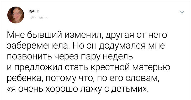 - Подруга развелась с мужем из-за его измен. Они продолжали общаться, так как у них четверо детей. Он был женат один раз официально и еще пару раз — без штампа. Она же пашет как лошадь и о замужестве даже не думает, хотя выглядит отлично. И вот недавно, спустя 15 лет, звонит ей бывший и говорит: «Я женюсь. На этот раз все серьезно. Ты, наверное, тоже выходи замуж, не жди меня больше».