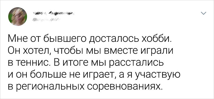- Расставание с первым бывшим буквально вытолкнуло меня из родной Тулы в Москву. Расставание со вторым — из уютной конторки в огромную корпорацию. После расставания с последним я очень удачно вышла замуж. Короче, нормальные чуваки — спасибо им от души.