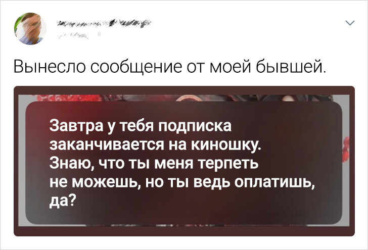 - У меня день рождения, и вдруг — видеозвонок от бывшего. Я с перепугу взяла. Он спросил, дома ли я, сказал, что у него есть подарок и он хотел бы его презентовать. Ну ок. Думаю, что сейчас приедет доставка, но от него пришло сообщение. Открываю — а там фото конверта на шкафу. Оказалось, он еще полгода назад его там спрятал, хотел сделать сюрприз, но потом забыл и вот решил отдать на день рождения. В конверте — деньги. Спасибо, приятно.
