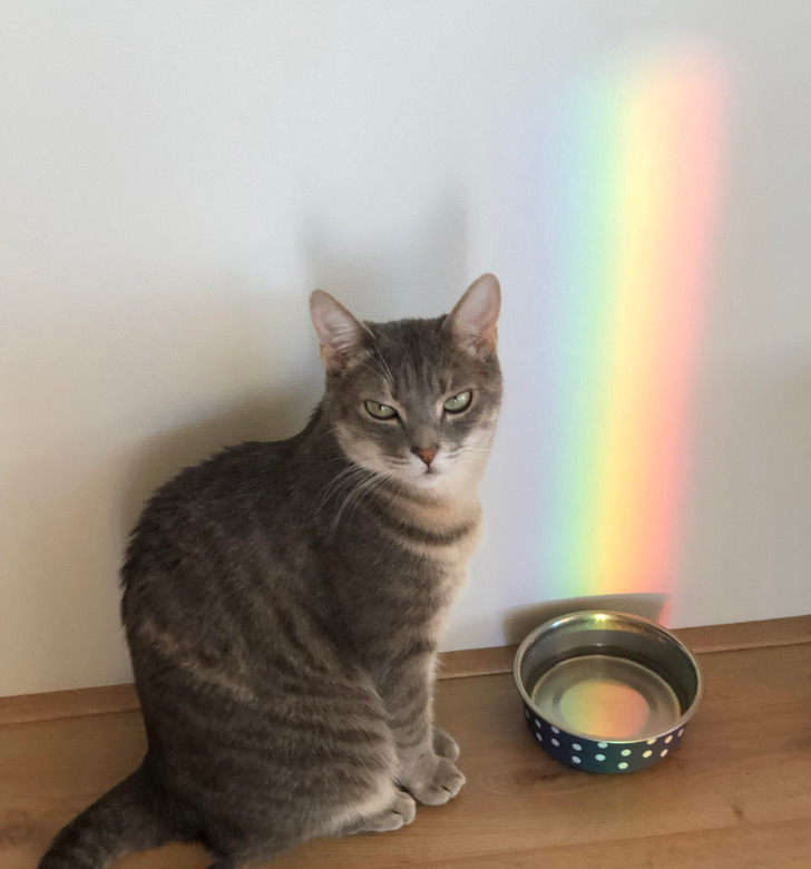 У кота с радугой выражение морды "о боже, как же легко тебя удивить..."