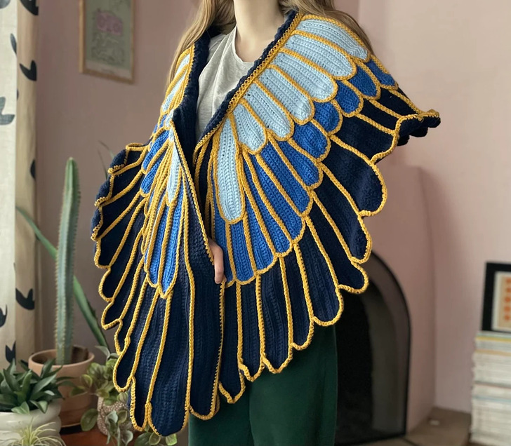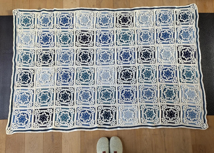 «После 160 часов работы, почти 2 килограммов пряжи и более 700 нитей, мой плед наконец-то готов»