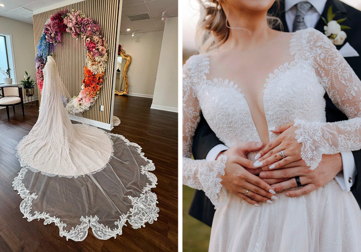 «Мое свадебное платье и длинная фата, полностью расшитые бисером. Сотни часов работы позади, и я невероятно горжусь результатом!»