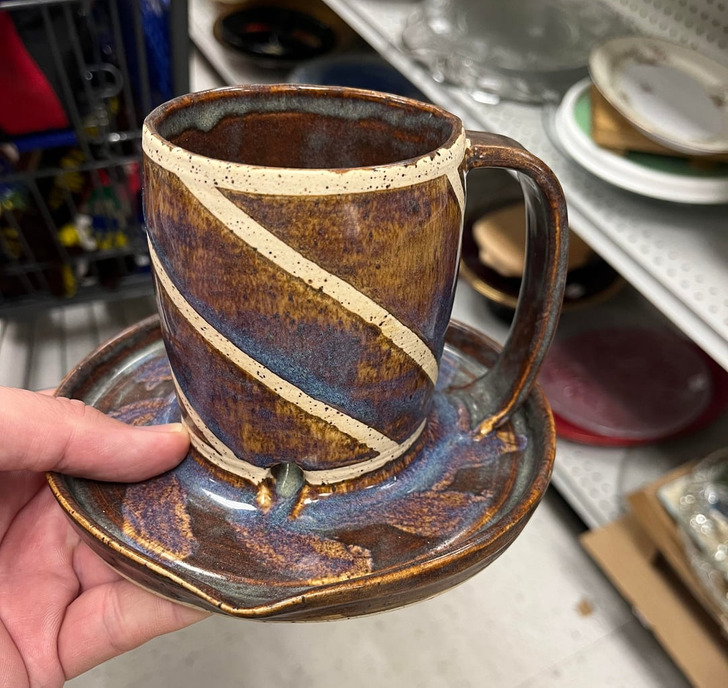 «Нашла в комиссионном магазине керамическую кружку, которая представляет собой единое целое с блюдцем. В самом низу сбоку у нее отверстие, а у блюдца есть носик»
