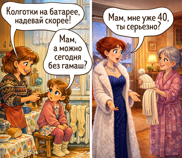 Мамина забота так вообще приятна в любом возрасте. Подогретые колготки или всунутая шапка — маленькие напоминания о том, что для мамы мы всегда дети