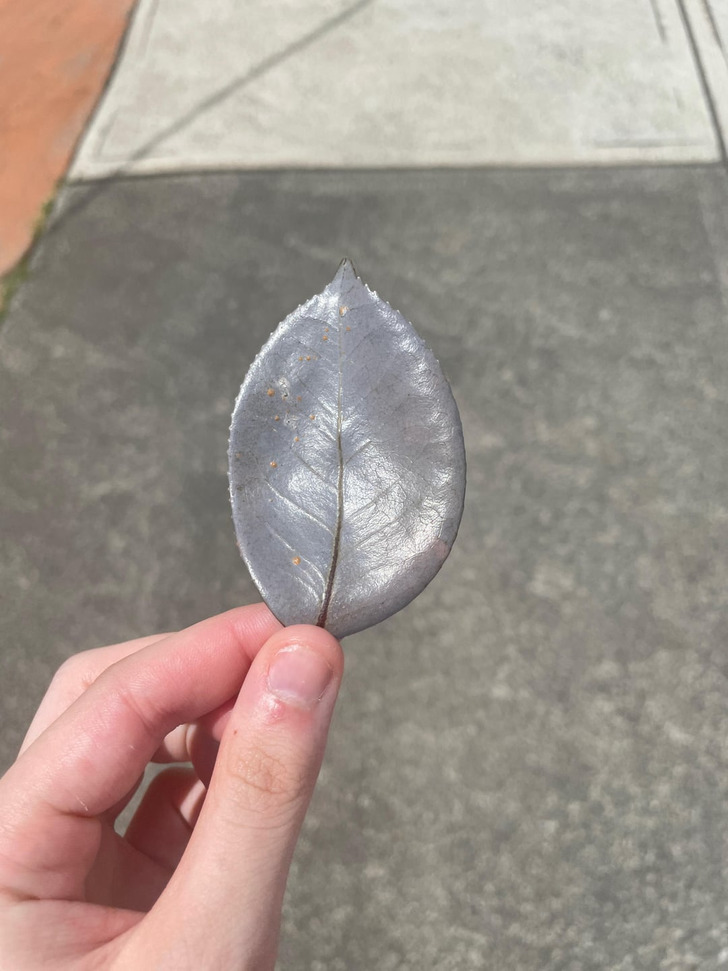 Споросила. Ии говорит, что лист окрашен, например, лежал около места, где делали граффити и его окрасили либо случайно, либо намеренно. В природе мёртвый лист может посереть, но будет прозрачным и тусклым. А здесь у нас "металлический" блестящий и цельный