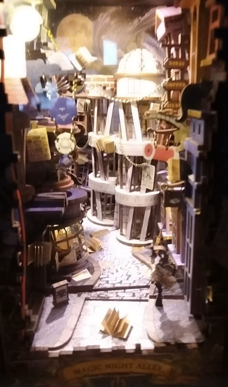 - 31 и 1 числа я тряпочкой валялась и болела. 2 января стало понятно, что в ближайшие дни прогулки отменяются. Итог: муж на даче чистит снег, а я сижу дома и усиленно лечусь. Но надо во всем искать положительные стороны, и я их нашла. Муж подарил мне румбокс «Косая аллея» по Гарри Поттеру на день рождения и я решила, что пришло время его собрать. В общей сложности, на сборку ушло часов десять. Но как же красиво он смотрится на книжных полках, мама дорогая! © cicuta78 / Pikabu