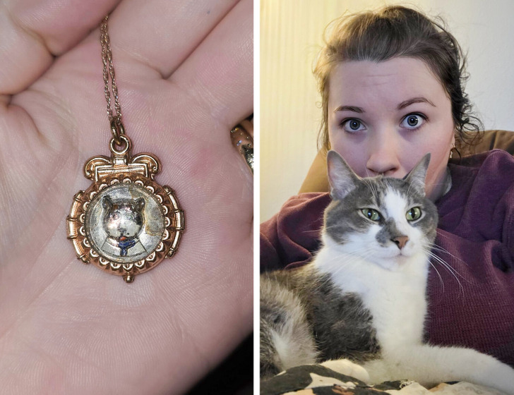 «С ней связана сентиментальная история: одинокий котенок родился в ту же ночь, что и я, и этот кулон у меня с самого рождения. На самом деле, это брелок для часов. Я думаю, что он относится к середине-концу 1800-х годов. А на втором фото — мой любимый кот, который выглядит точь-в-точь как на брелоке. Он мой лучший друг в мире. Так было суждено!»