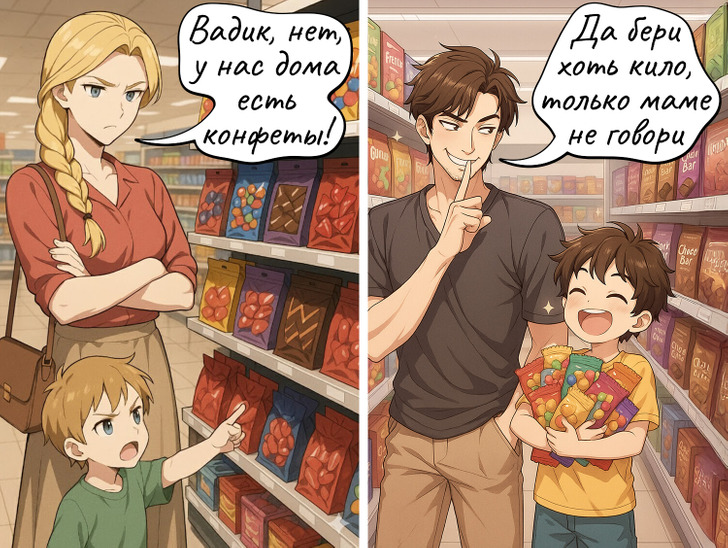 Даже поход в магазин с ребенком превращается в испытание: маму уговорить что-то купить сложно, а папа берет все подряд, даже если дома этого уже навалом