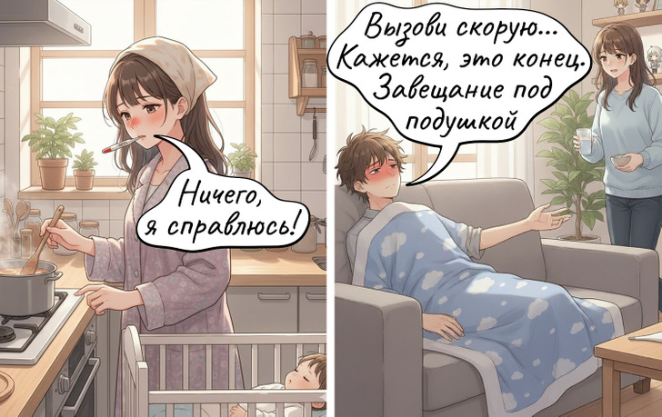 Женщина не забывает про свои дела даже при температуре под 38, а мужчина при малейшем недомогании сразу готовит завещание