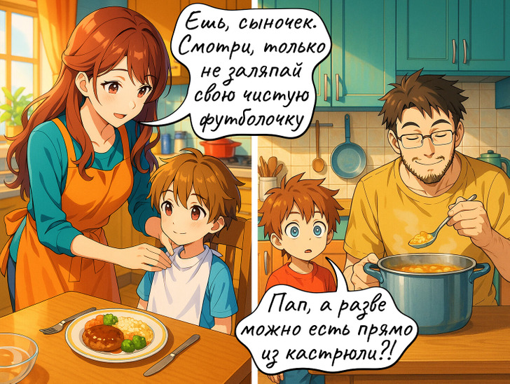 Мама учит ребенка есть аккуратно и соблюдать все правила этикета, а вот у папы немного другой подход