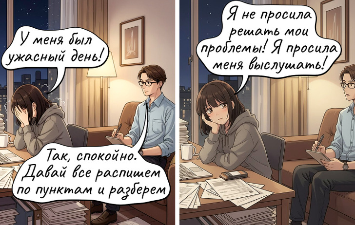 Мужчина сразу ищет способ помочь и решить все проблемы, а женщине достаточно, чтобы ее просто выслушали