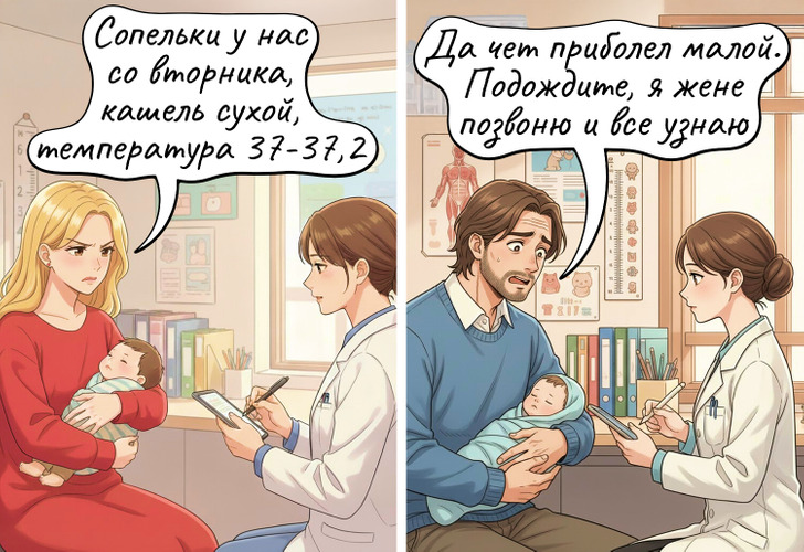 Дибилушку какого то изобразили. В поликлиниках куча отцов детей по врачам водит и на осмотры и простуду лечить