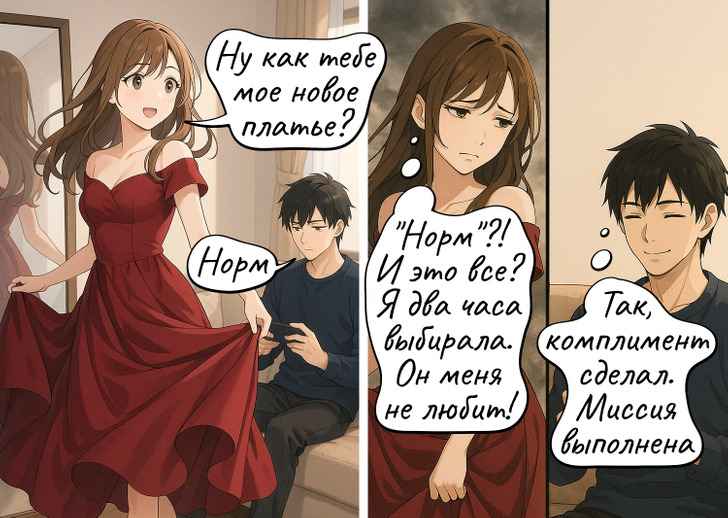 «Мужчины с Марса, женщины с Венеры» — эта фраза уже стала классикой, но она по-прежнему актуальна. Мы действительно порой по-разному смотрим на одни и те же вещи: от выбора цвета стен до сборов в отпуск. Он ищет логику, она — эмоции. Он хочет решить, она — обсудить. Мы подобрали 19 комиксов, которые с юмором показывают, как выглядят столкновения двух совершенно разных миров.