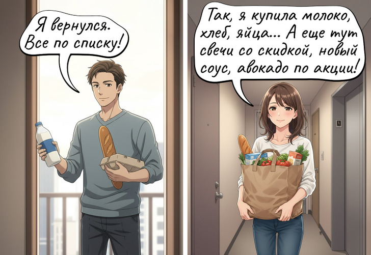 Мужчина идет в магазин по списку и берет ровно то, что нужно. Женщина идет по тому же списку... и возвращается еще с парой сумок, потому что «для дома пригодится»!
