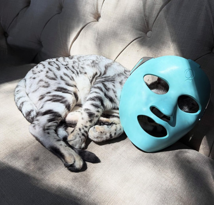 Какой красивый окрас у котика. Леопардово-тигровый. Лучше бы без этой дурацкой маски сфоткала.