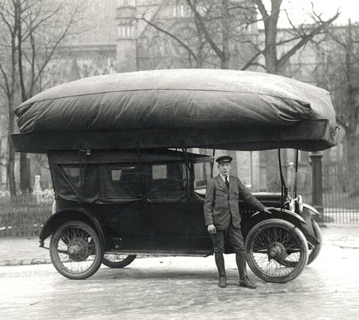 На крыше автомобиля расположен баллон с газом, который в те времена использовался вместо бензина.