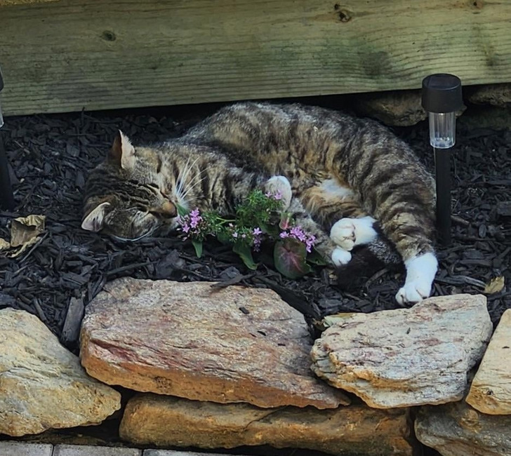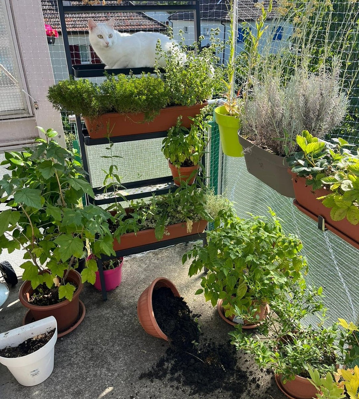 Как вы могли про этого ангелообразного кота так подумать! Он просто отдыхал сверху, а горшок стал сам из себя землю выбрасывать.