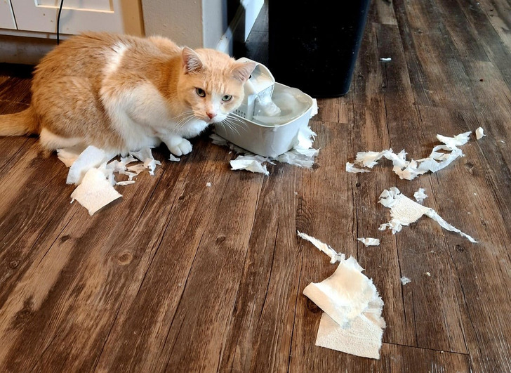 - Мой 14-килограммовый кот просунул свою голову через ручки пластикового пакета с мусором. Вдоволь наевшись объедков, он решил, что можно закругляться, но не тут-то было — пакет его не отпускал. В процессе отступления кот понял, что за ним идет что-то большое и белое, и испугался. Этот 14-килограммовый наглец несколько раз обежал весь дом, разбрасывая содержимое мусорного пакета по всем комнатам.