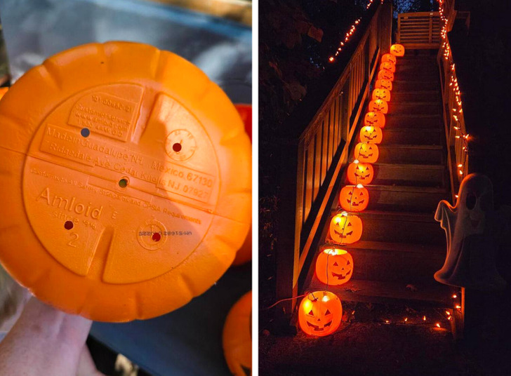 «Взяла дешевые пластиковые тыквочки, просверлила дырки, чтобы стекала вода (если вдруг дождь), вставила гирлянду — по две лампочки в каждую. Получилось уютно и атмосферно!»