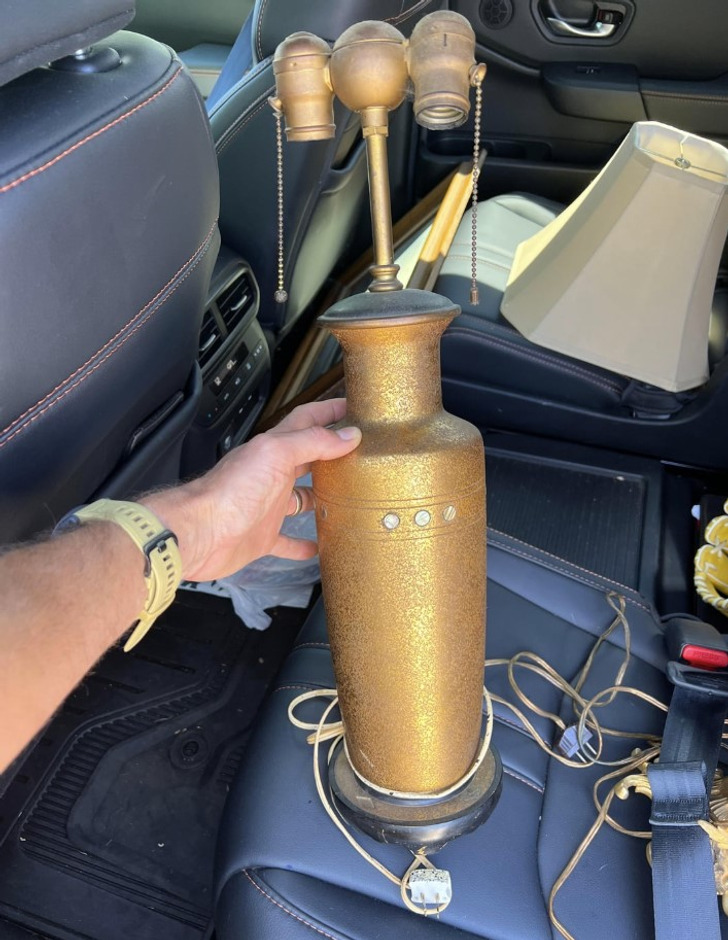 Сходила в первоисточник. Это лампа Тиффани самого начала 20-ого века. Сзади абажур видимо от неё. А основание - вроде как из вазы, в которой дырочку просверлили.
