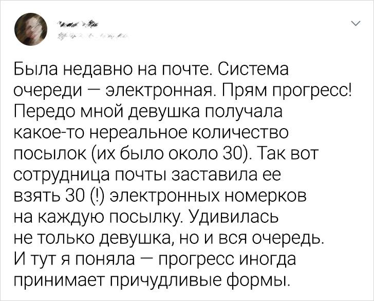 • Была на днях в почтовом отделении возле своего дома. Там всегда спокойно и мало людей, но только не в этот раз. Многие из посетителей пришли даже не за своими посылками, а за зрелищем, которое устроил какой-то мужик. Он решил сам проверить рыбацкую надувную лодку прямо в отделении. Надул ее, разложил, сел и услышал, как она сдувается! Даже ничего доказывать не пришлось. Все сами все видели. Брак. Возврат. © Не все поймут / VK