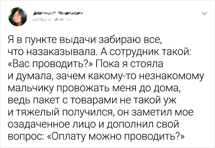 • Захожу в пункт выдачи за наполнителем для лотков. Я его заказываю в «экономичном» мешке весом около 12,5 кило. А там новая смена — мальчики-зайчики лет по 17–19. Нашли мне этот мешок, еле-еле вдвоем притащили со склада, кое-как отсканировали, по полу потянули ко мне. И такие тревожно: «Ой, а как вы это донесете?»