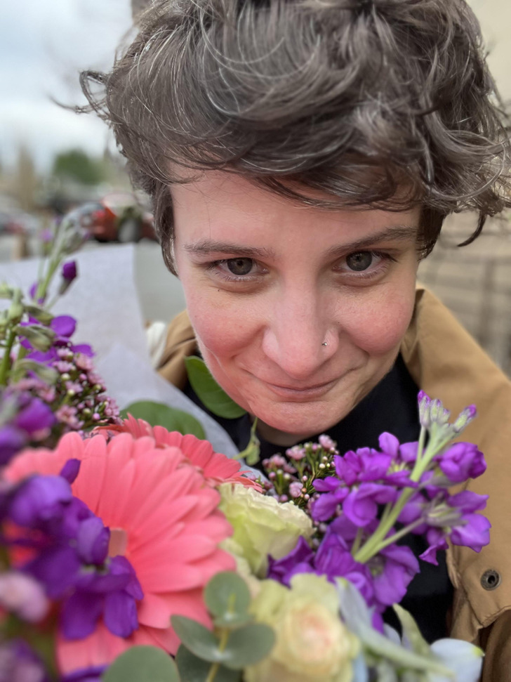 «В один из самых трудных дней на работе коллеги вручили мне букет. Только взгляните на мое счастливое лицо интроверта»