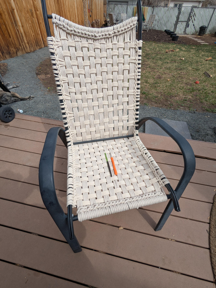 «Я спас старый каркас для кресла благодаря силе макраме. На это ушло 122 метра веревки. Получилось шикарно, но жестковато. Пожалуй, стоит добавить подушку»