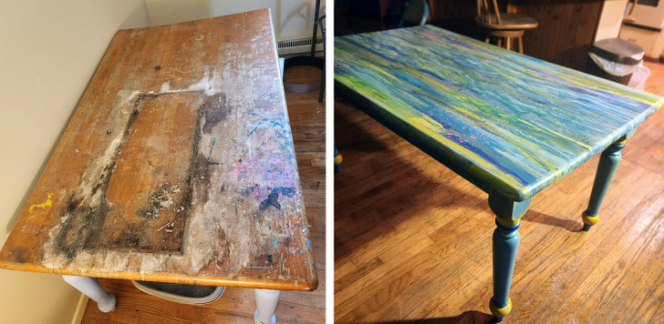 «Этот стол судьба потрепала. Раньше мы использовали его для художественных проектов и аквариума. Так что я решила отразить это в преображении»