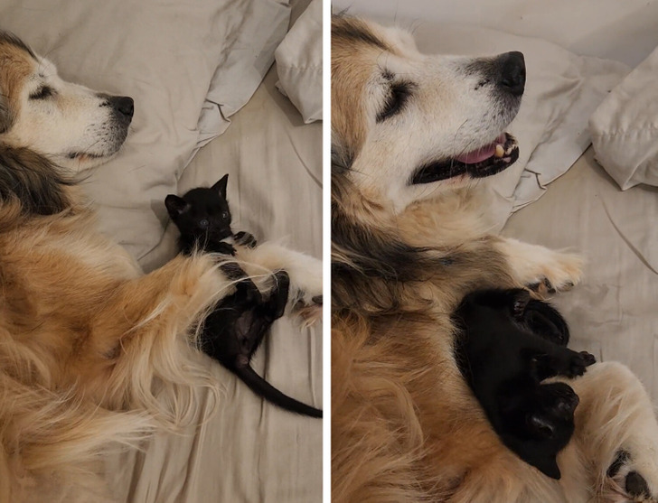 Вопрос, где котенок будет спать, решился раз навсегда. Конечно, на большой теплой собаке.