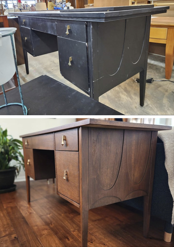 «Впервые реставрирую мебель, и, ух, какой же это был опыт! Какой красивый шпон был под всей этой краской!»