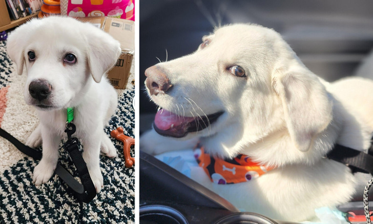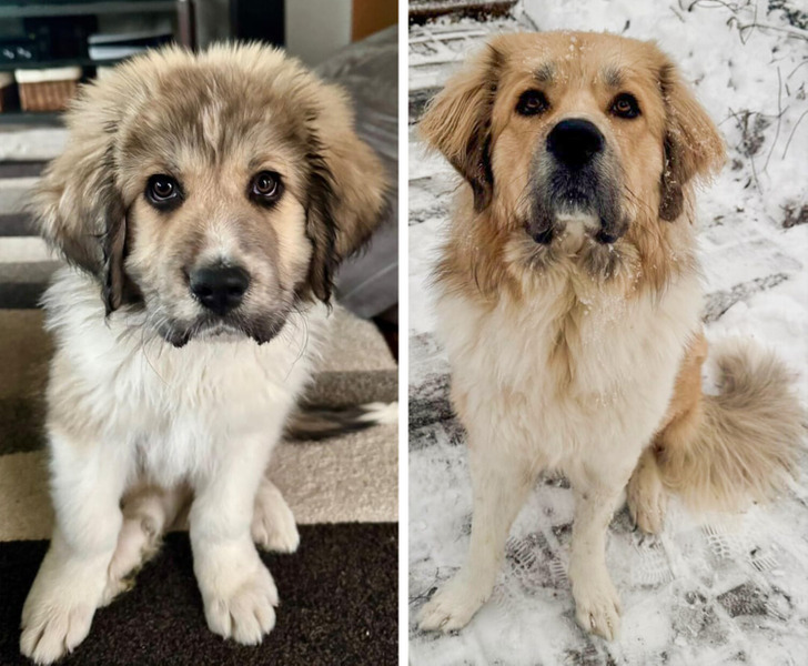 «Это Маугли — помесь пиренейской горной собаки и хаски. На втором фото ему уже полгода. Он очень общительный и обожает людей»