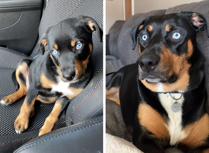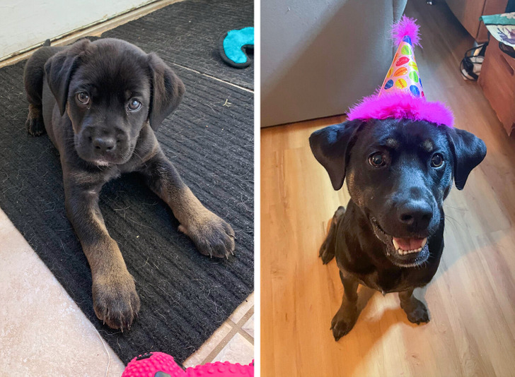 «Это Вафелька. Она — чудесная помесь ротвейлера и лабрадора. На первом фото ей около 6 недель, а на втором — целый год»