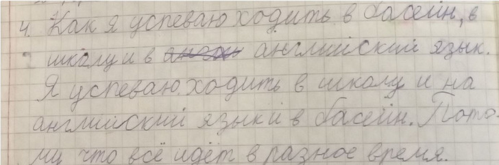«Недавно был у бабушки и просматривал старые фотоальбомы. Оказалось, что она сохранила письма, которые я ей писал в 2002–2003 году. И в них я рассказывал о своей детской жизни и отвечал на ее вопросы. Вот, что я ответил на ее вопрос «Как ты успеваешь ходить в школу, в бассейн и на дополнительные уроки английского языка?»